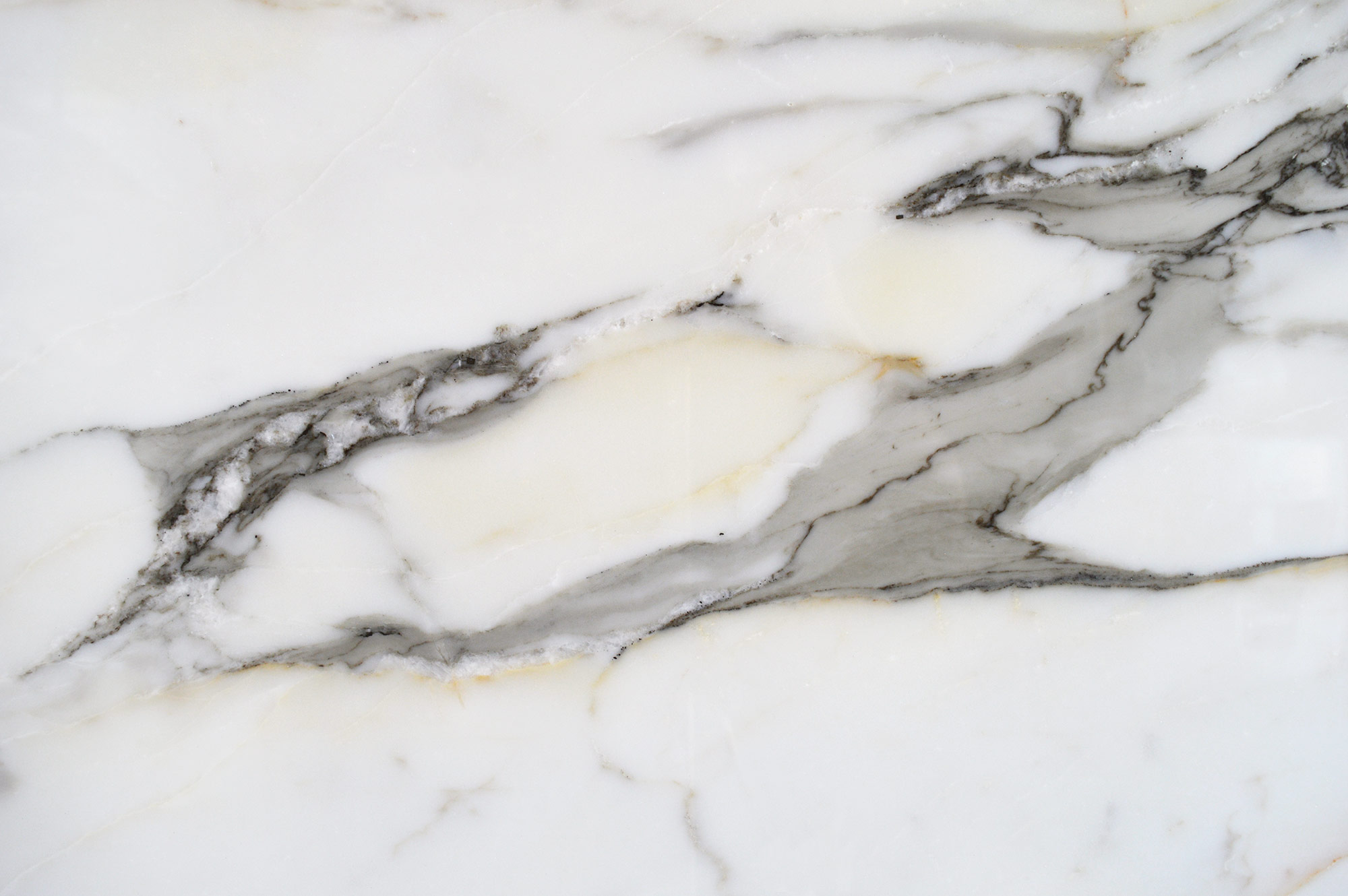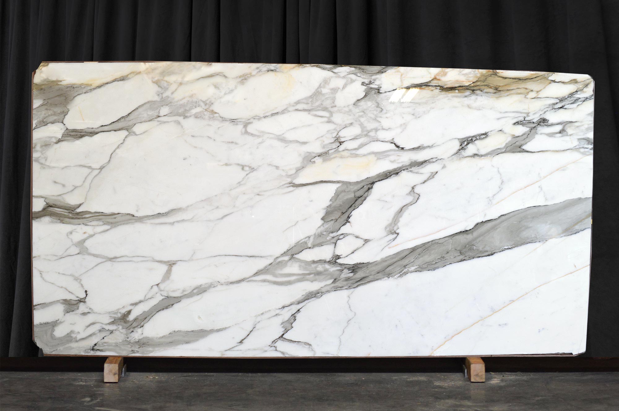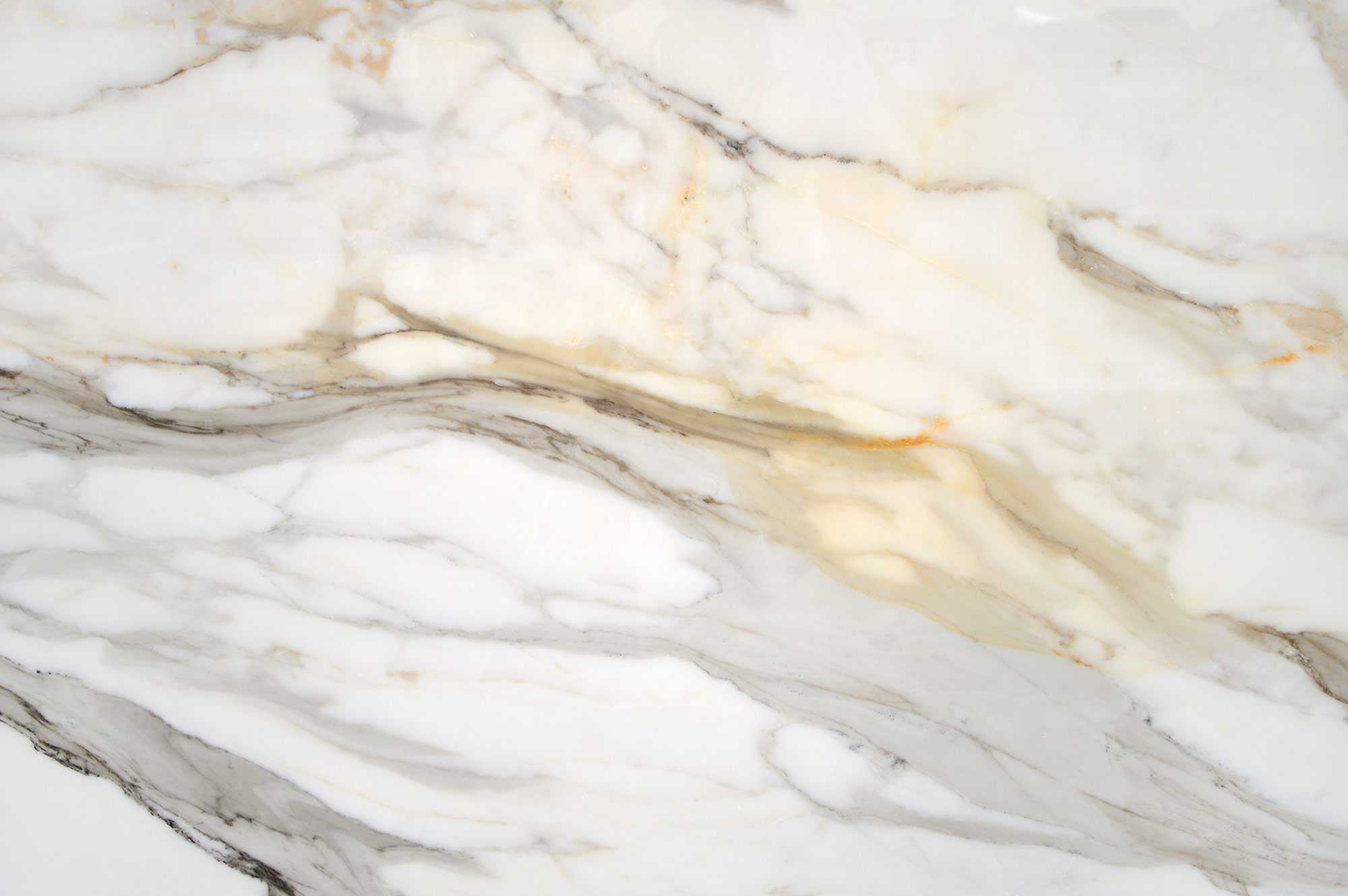 Calacatta Borghini is a large-format natural marble slab from Italy, ideal for floor, countertop, wall, or fireplace applications. Elegant vein movements with stunning gold accents.