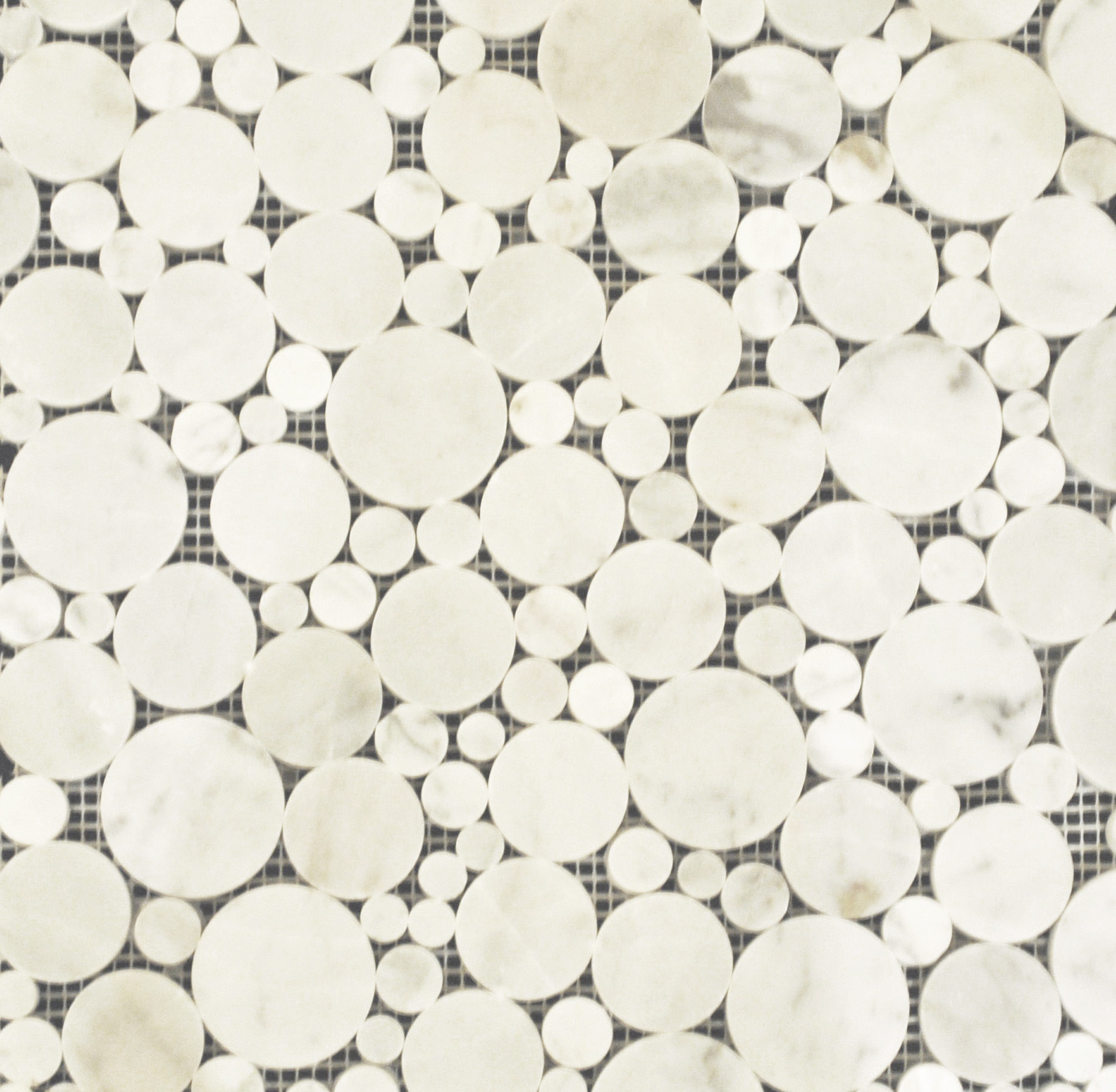 Calacatta Gold Large and Small Round has a beautiful arrangement of marbles that gives this mosaic a bubbling look. It also has a majority color of white with some detail of calacatta gold and a polished finish to give this mosaic a gleaming look.