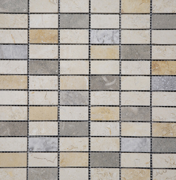Dorado Symmetry Mix 1×2 marble comes in a color variety of cream, gold, and grey tiles that piece together for a desert look. This mosaic also comes in a polished finish for a glossy shine.