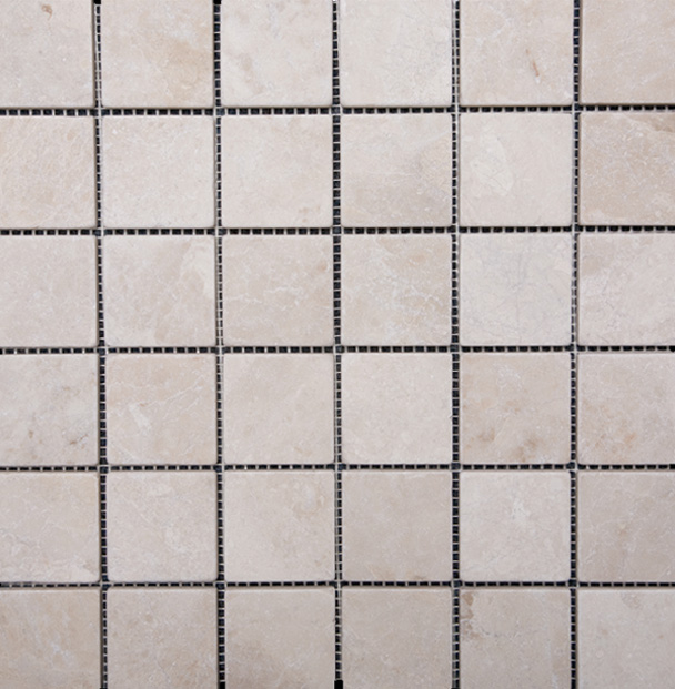 Fiorito Beige 2×2 comes in a beige and cream color with white subtle veins that give this mosaic a hint of contrast. Fiorito Beige 2×2 also has a polished finish for a glossy shine or a tumbled finish for a more natural stone appeal.