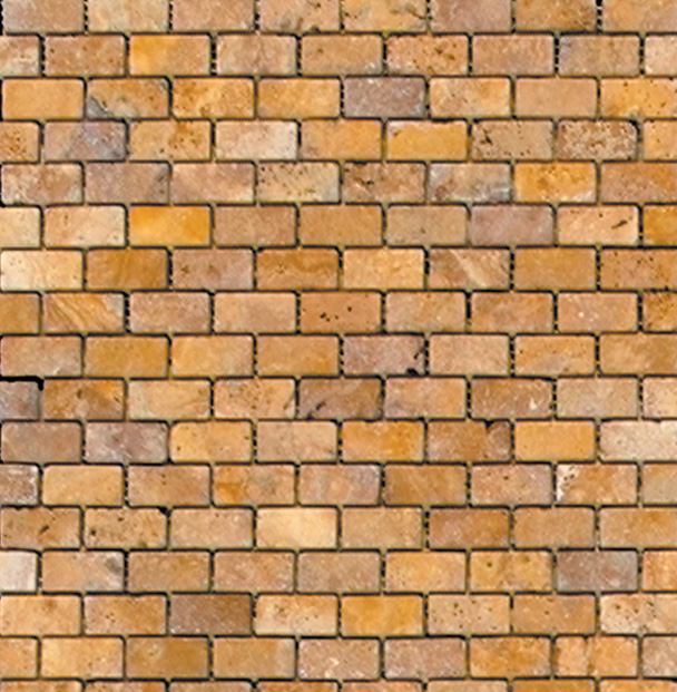 Golden Sienna Mini-Brick has a color of gold, orange, and beige for an eastern desert setting. This mosaic also has tumbled finish for a rough natural arrangement.