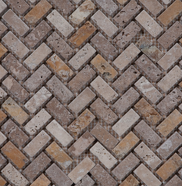 Mixed Herringbone travertine comes in a variety of color detail with brown and grey being the most apparent for a dark theme. This mosaic also has a tumbled finish for a smooth yet natural appeal.