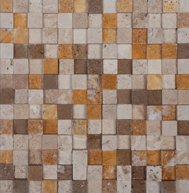 Mixed Travertine 1×1 comes in a variety of colors, but most apparent in brown, white, and gold. This mosaic also has a tumbled finish for a smooth, yet natural looking arrangement of tiles.