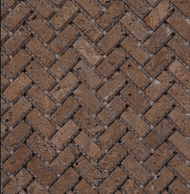 Noce Herringbone travertine comes in caramel brown for an appeal of a darker color scheme. This mosaic also has a tumbled finish for a smoothed and natural looking arrangement of tiles.