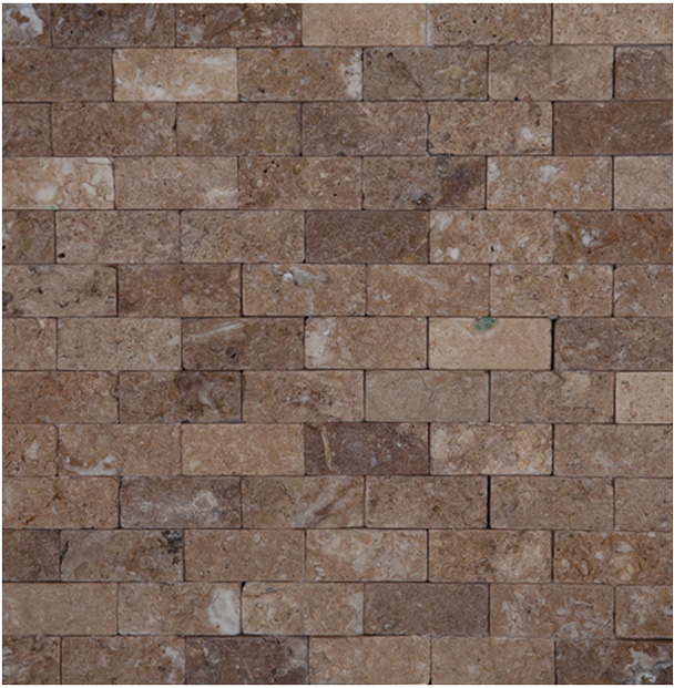 Noce Split-Face 1×2 travertine comes in a brown color detail with white spots that are apparent across this mosaic. This piece also has a split-face finish for a rough natural orientation.