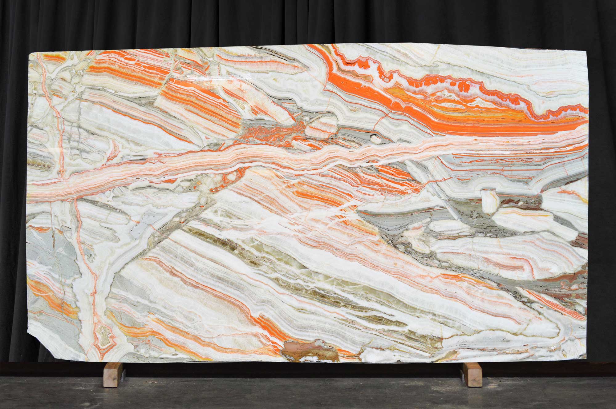 Onyx Multicolor is a large size natural onyx slab. Features vibrant, unique colors and details that bring an abundance of personality to any space. An lively stone perfect for the bold.