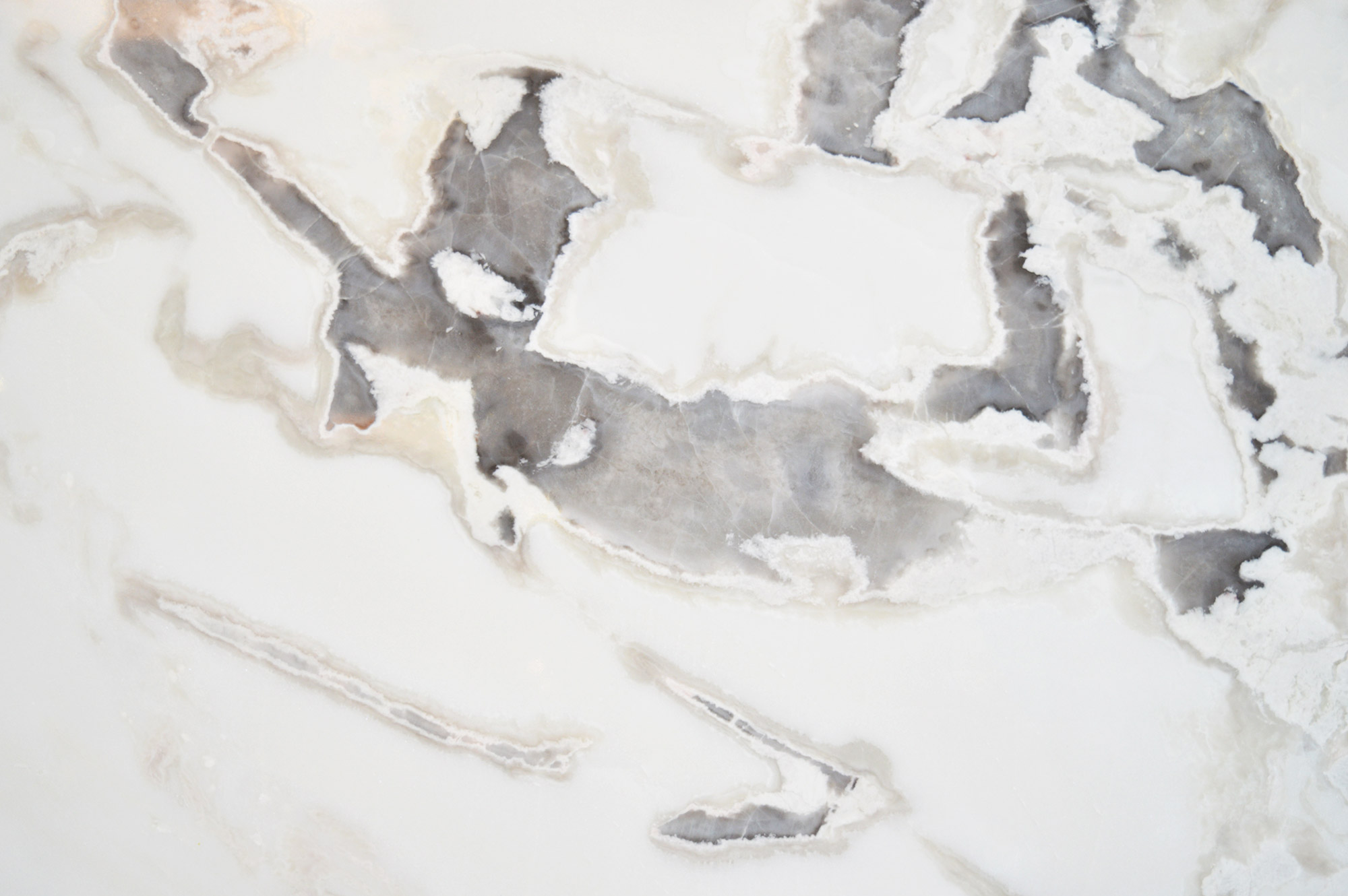 Natural white dolomite slab with stylish grey and cream details. Perfect for flooring, walls, and countertops.