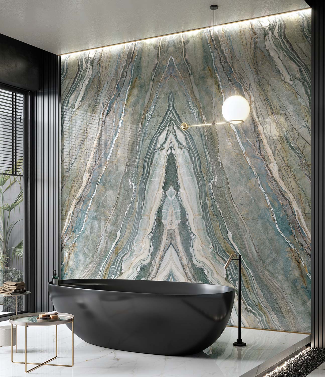 The Royal Peacock porcelain slab has structural, aesthetic and functional characteristics that make it a unique option for furnishings and indoor and outdoor floor, countertop and wall coverings.