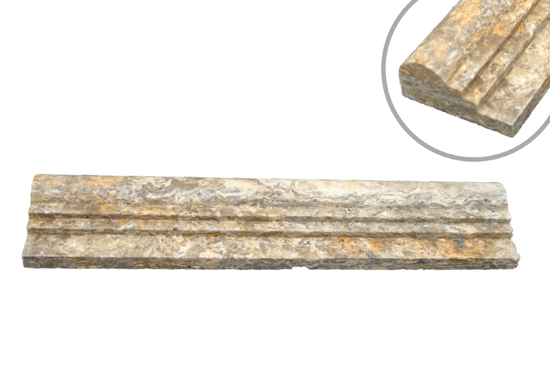 Scabos 2 Step travertine comes in a color of white and gold with extra detail of beige that gives this trim a snowy wood appeal. This piece also has a honed finish for a smooth matte touch and look.